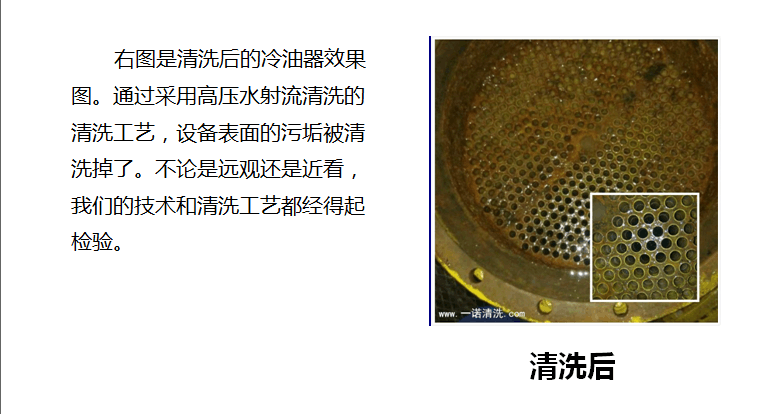 2.冷油器清洗除去污垢后,保持油溫穩定,消除了設備磨損隱患,提高了工作效率,同時(shí)也延長(cháng)了其使用壽命。